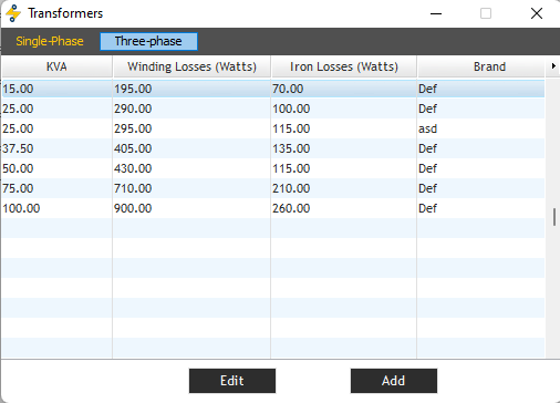 Choose from a variety of default transformers, or add your custom transformer and input its kVA, iron and winding losses, brand, etc.