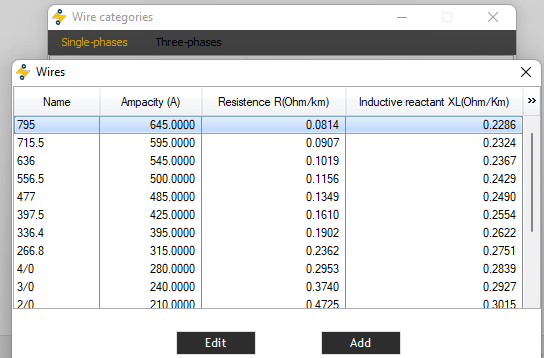 Choose from a variety of default wires, or add your custom wire and input all of its specs such as conductor material (e.g Aluminum, Copper), resistance, ampacity, inductive reactance, etc.